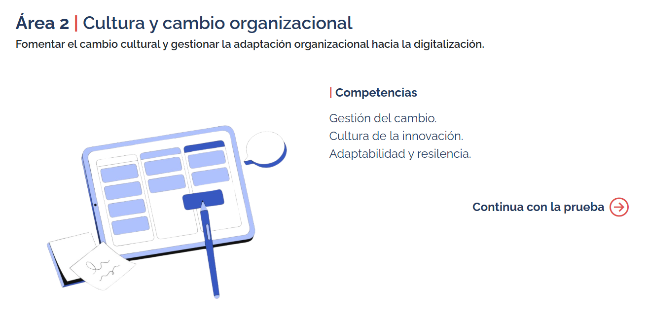 El Test completa todas las áreas del marco de competencias. En total, consta de 6 áreas, y cada área contiene entre 4 y 6 preguntas.